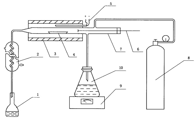 1-容量瓶;2-冷凝管;3-高溫爐;4-瓷舟;5-鉑銠一鉑熱電偶;6-進(jìn)樣推棒;7-燃燒管;8-氧氣鋼瓶;9-調(diào)溫電爐;10 -平底磨口燒瓶。 按圖所示裝配好全套儀器,連接好電路、氣路和水路各個系統(tǒng),將高溫爐升溫到1100℃。往燒瓶中加入約300 mL水并加熱至沸騰,冷凝管通入冷水。塞緊進(jìn)樣推棒硅膠塞,在平底燒瓶中水沸騰之前通人氧氣,調(diào)節(jié)氧氣流量為400 mL/min,檢查系統(tǒng)不漏氣后,通入水蒸氣和氧氣空蒸15 min。 操作試驗步驟 稱取(0.50±0.01)g 一般分析試驗煤樣(稱準(zhǔn)至0.1 mg)和0.5 g石英砂放在瓷舟里小心混合均勻,再用約0.5 g石英砂鋪蓋在上面。將100 mL容量瓶放在冷凝管下端接收冷凝液。取下進(jìn)樣推桿,把瓷舟放入燃燒管內(nèi),插入進(jìn)樣推桿,塞緊硅膠塞。將瓷舟的前端推到預(yù)先測好的約300℃區(qū)域停留5 分鐘,接著推進(jìn)到約600℃區(qū)停留5分鐘,再推進(jìn)到約900℃區(qū)停留5分鐘,最后把瓷舟推到1100℃的恒溫區(qū),拔出進(jìn)樣推桿以免融化,樣品在恒溫區(qū)繼續(xù)燃燒分解15分鐘。在整個操作過程中,調(diào)節(jié)燒杯內(nèi)水的蒸發(fā)量,水解開始15分鐘內(nèi),容量瓶中每分鐘收集約3mL,后15分鐘,每分鐘收集約2.5 mL,最后總體積應(yīng)控制在85 mL以內(nèi)。燃燒-水解完成后,移走容量瓶。停止通氧氣,取下送樣推棒,取出燃燒舟。 測量電位 在100 mL燒杯中加入一定量的水,連接好電位測量裝置,開動攪拌器,更換燒杯中水?dāng)?shù)次,直至毫伏計顯示的電位值達(dá)到氟電極的空白電位。 在5個用水沖洗過的100 mL容量瓶中,分別加入100 ug/mL的氟標(biāo)準(zhǔn)工作溶液1 mL,3 mL,5mL,7 mL,10 mL,加入3滴溴甲酚綠指示劑,10 mL總離子強度調(diào)節(jié)緩沖溶液,用水稀釋到刻度,搖勻,靜置30分鐘。 計算結(jié)果: 煤中氟的含量(Fad)按下面公式)計算,測定結(jié)果修約到個位。